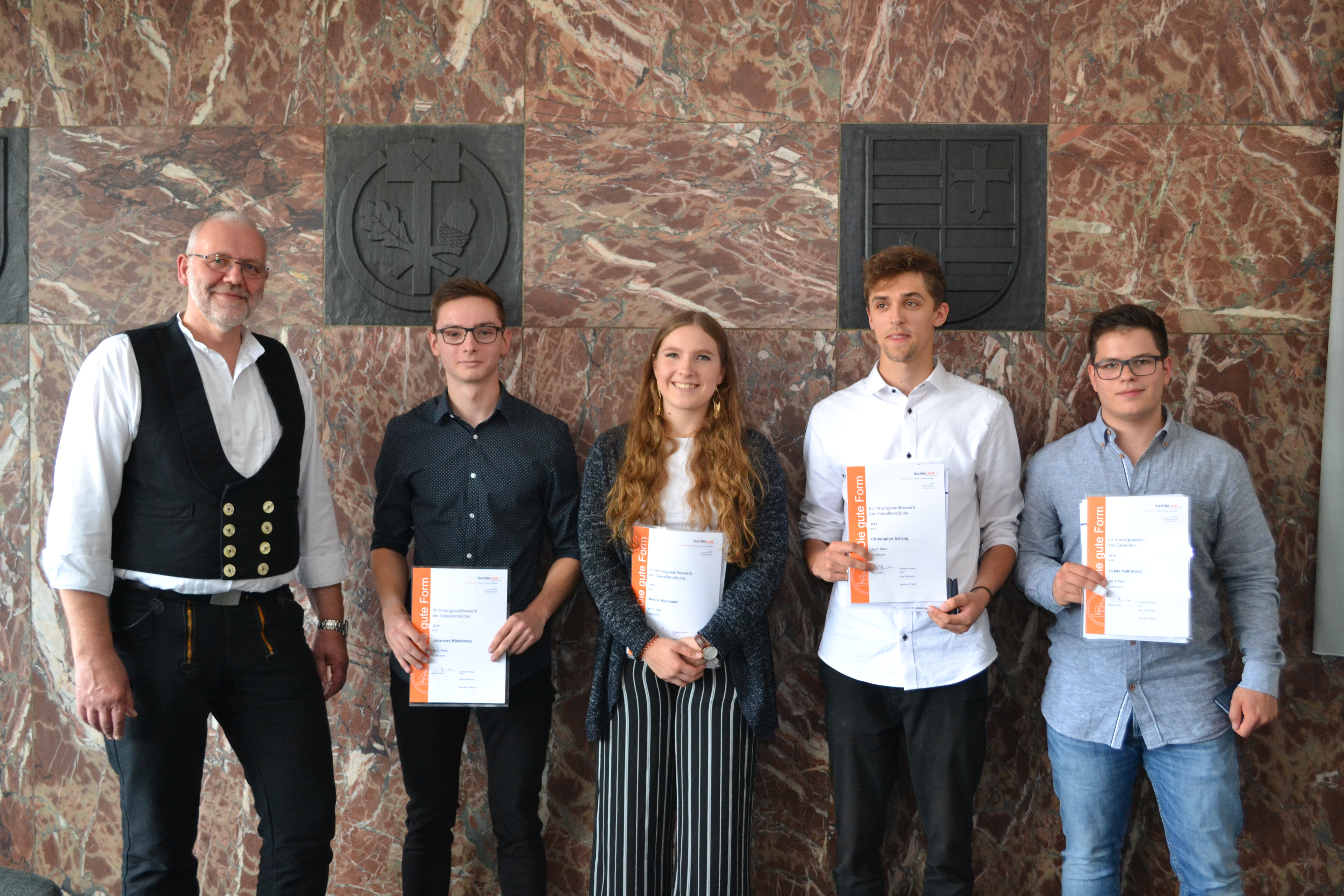 Für sein besonderes Ergebnis und Engagement zeichnete der Obermeister der Tischler-Innung Oldenburg - Tischlermeister Reiner Huntemann - den Junggesellen Marius Kohler mit einem Geldpreis aus und lobte die Ausbildungsleistung der Möbelwerkstatt Kirstein Schubert OHG, Oldenburg.